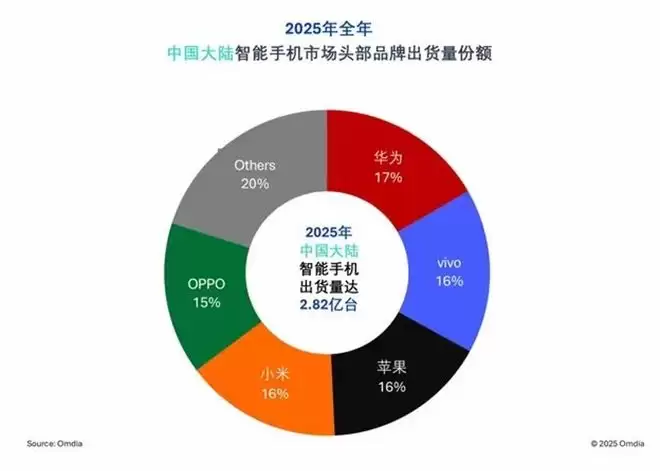 Counterpoint、Omdia、IDC等主流市研机构给出的2025年全年中国手机市场出货量TOP3均为华为、苹果、vivo,由于vivo和苹果的出货量极为接近,因此基本上可以看作并列第二。