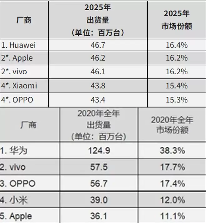 ▲2025年、2020年华为全年手机出货量及市场份额,来源:IDC
