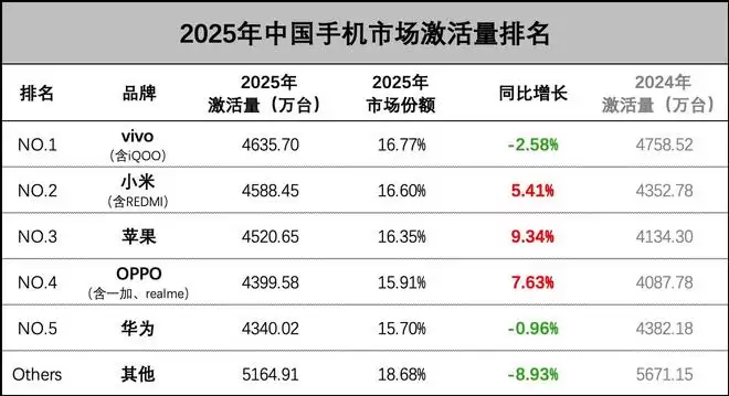 最近讨论热度最高的一张图,是2025年中国手机市场激活量排名,TOP5的排序与IDC出货量排名有较大差异。其中vivo、小米、苹果排名前三,华为排名第五。