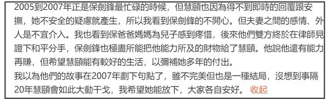 对于两人的关系发展,经纪人表示看到保剑锋的不开心,以及保剑锋父母心疼儿子,但外人并不适合介入,两人于2007年在律师见证下和平分手。保剑锋把所有财物给了女方,希望女方能好好的生活,从而弥补女方的付出。在文章末尾,前经纪人再次强调女方时隔20年大动干戈,希望她能放下,大家各自安好。