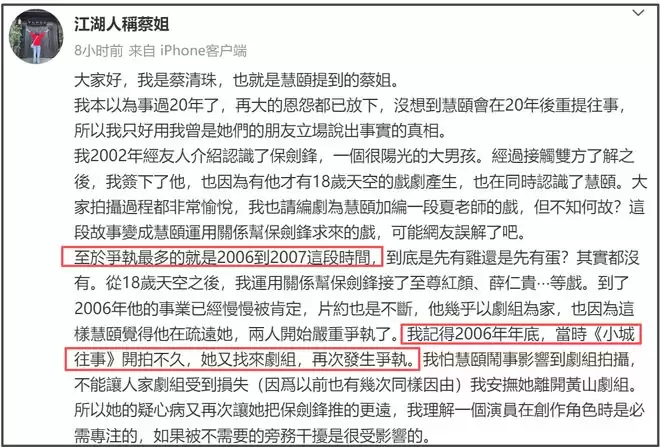 前经纪人蔡清珠表示自己是以双方朋友的立场说出事情的真相。第一个重点是《十八岁的天空》并非黄慧颐运用关系帮保剑锋拿到的戏,而是保剑锋跟她签约后拍的第一部戏,同时认识了黄慧颐,并邀请编剧为她加编了夏老师的戏份。之后她又用关系给保剑锋运作了《至尊红颜》、《薛仁贵》等戏。