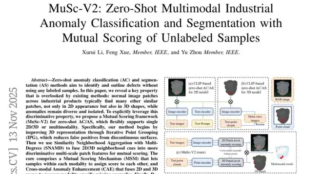 这项由华中科技大学电子信息与通信学院的李旭瑞和周瑜教授团队,联合意大利特伦托大学薛峰博士完成的研究,于2025年11月发表在arXiv预印本平台上,论文编号为arXiv:2511.10047v1。有兴趣深入了解的读者可以通过该编号查询完整论文。这项研究提出了一个名为MuSc-V2的全新工业异常检测框架,实现了机器在完全没有标注样本的情况下,仅通过观察未标记数据就能准确识别工业产品缺陷的突破。