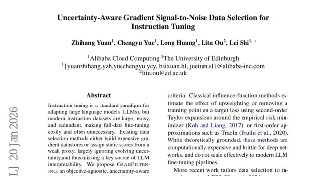 阿里云计算联合爱丁堡大学的研究团队最近发表了一项突破性研究,提出了一种名为"GRADFILTERING"的创新方法。这项研究于2026年1月在arXiv平台发布,论文编号为arXiv:2601.13697v1。研究团队开发出了一套"智能挑书助手"系统,能够精确识别出那些真正有助于AI学习的高质量训练数据,从而大大提升训练效率。