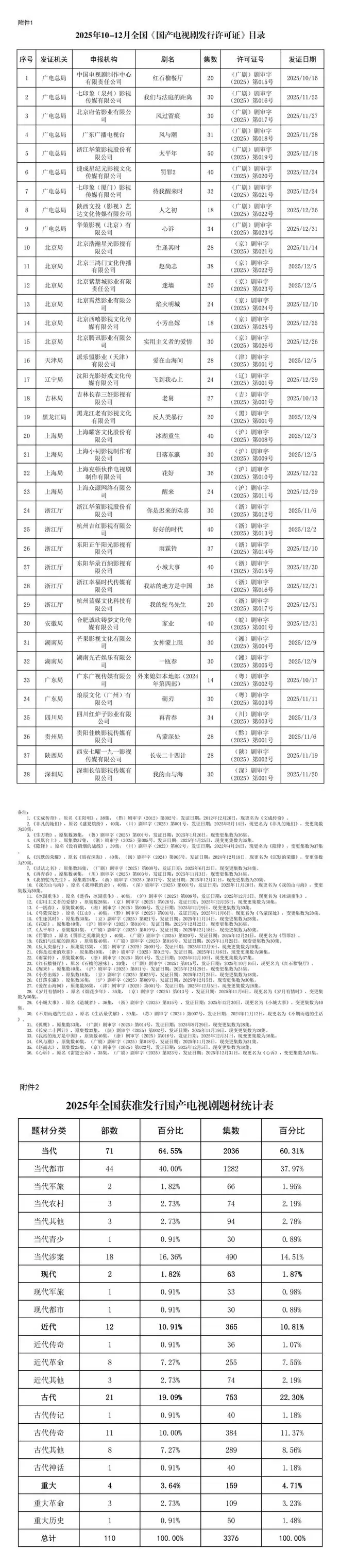 二、2025年全年全国生产完成并获得《国产电视剧发行许可证》的剧目110部3376集