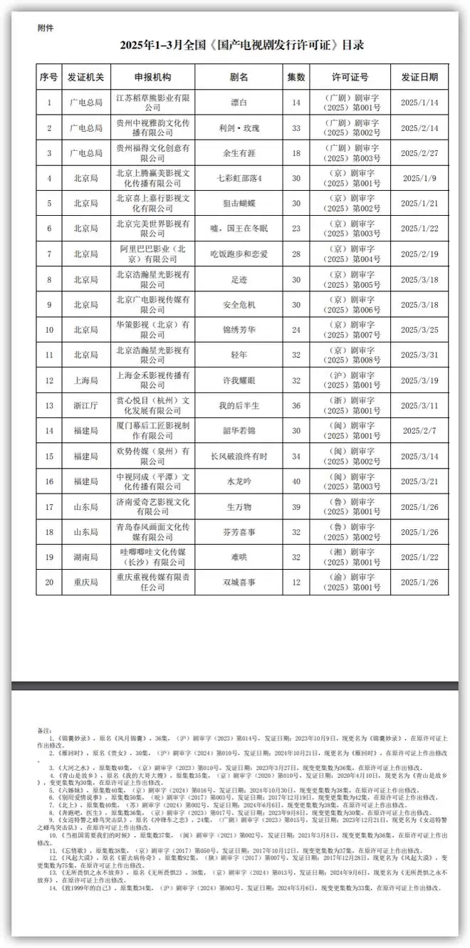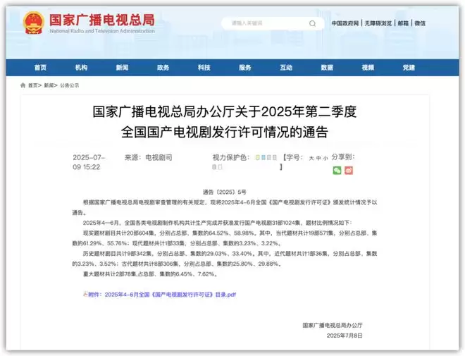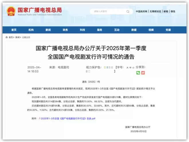 今年4月,国家广播电视总局发布《关于2025年第一季度全国国产电视剧发行许可情况的通告》。