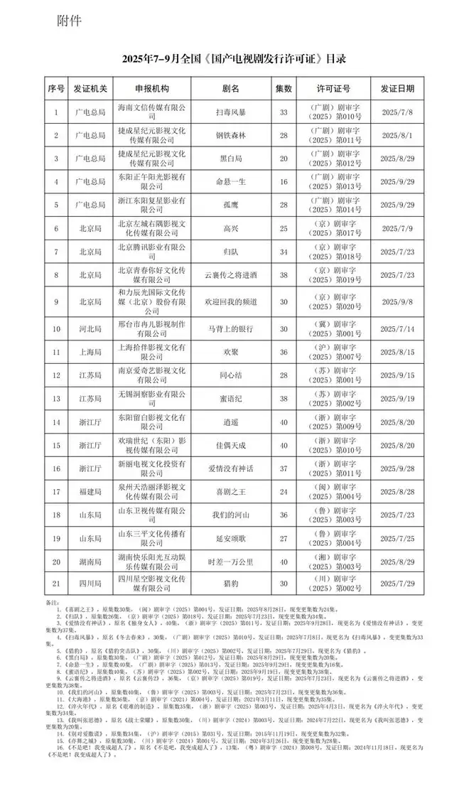 国家广播电视总局发布2025年7-9月全国《国产电视剧发行许可证》颁发统计情况。
