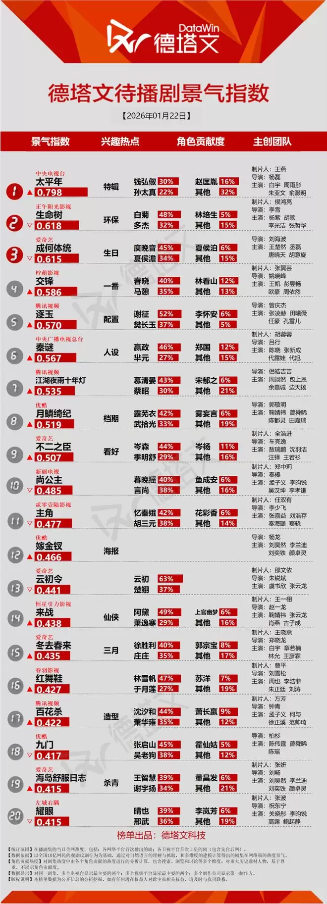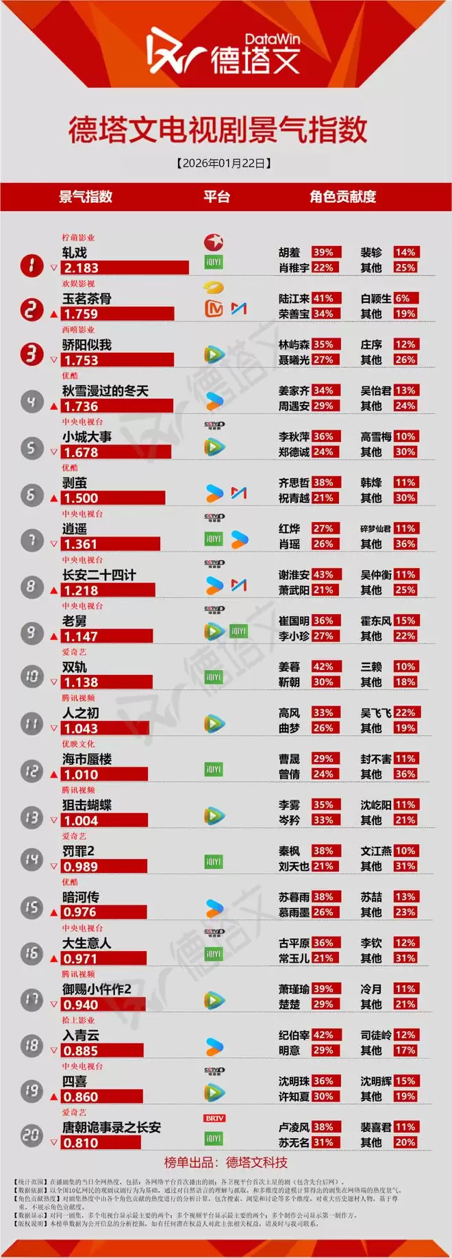 古装爱情剧《玉茗茶骨》于1月21日迎来VIP收官,该剧播出期景气峰值达2.151,CVB收视率在收官阶段攀升至0.381%,展现出较强的用户粘性,属于以特定题材优势突围的圈层热播剧。