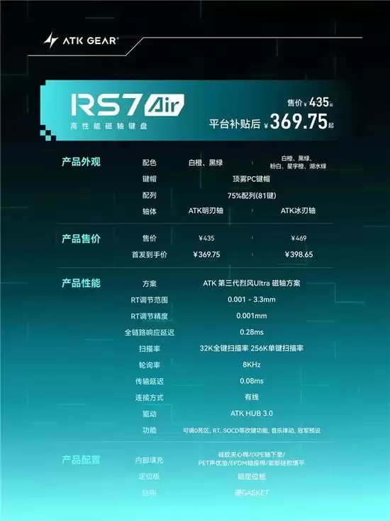 ATK RS7 Air高性能磁轴键盘将于1月21日20:00正式开售,首发补贴价仅369.75元起,300元亲民价位带来越级旗舰磁轴体验,非常适合诸如无畏契约、CS2、三角洲行动等需要快速反应与精准操作的竞技游戏。现在立即入手,助你掌控全局,稳操胜局,全能配列 强如所见!