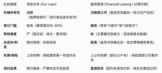 ▲ AI 总结的正常车贷和融资租赁的主要差别