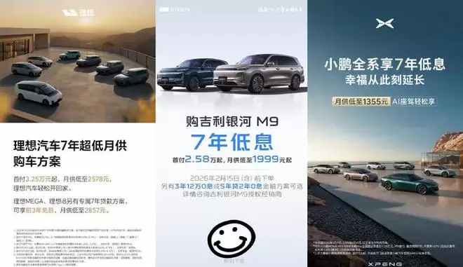 紧接着,理想汽车也宣布为 MEGA 与 i8 提供专属 7 年贷款方案,主打「前三年免息」,把月供压到了 2857 元的区间。就在最近,小鹏汽车以及吉利银河 M9 也加入了这一行列。