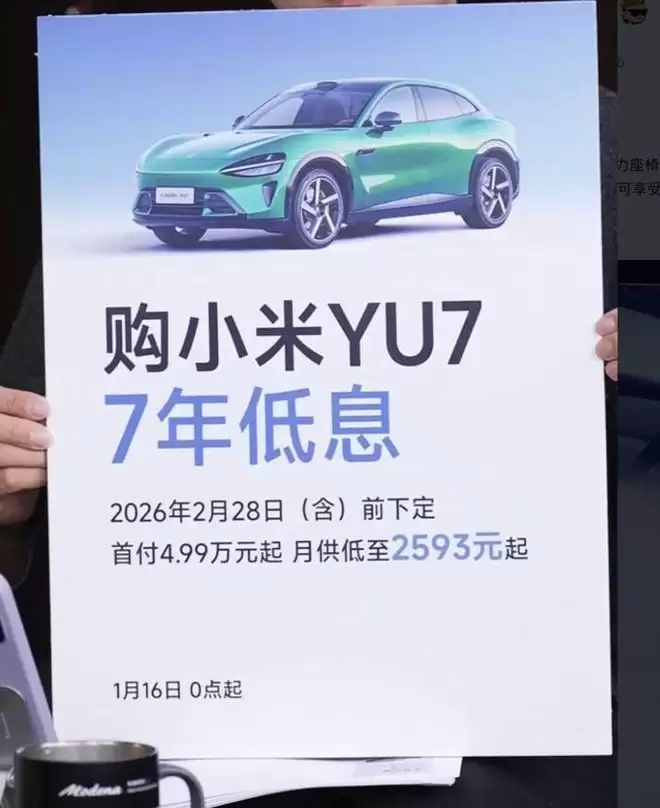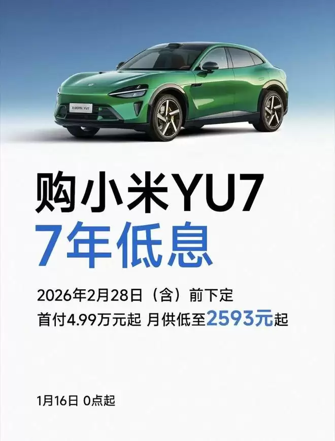 1 月 16 日起,小米为 YU7 推出了 7 年超低息方案,覆盖到 2026 年 2 月底前完成下定的用户。