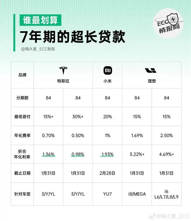 微博博主 @ 嗨大星_ECC 对比了特斯拉、小米、理想三家的金融方案区别,从中可以明显看出,特斯拉和小米都有明显的利率补贴,其中特斯拉在首付 30% 的情况下,将折合年化利率做到了 1% 以下,而理想的年化利率则来到了 4.6% 以上。