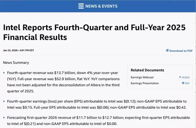 英特尔2025年第四季度业绩超华尔街预期,但2026年一季度业绩指引表现疲软,盘后股价跌超13%。