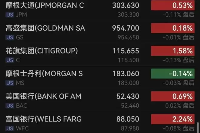 银行股多数上涨,摩根大通涨0.53%,高盛涨0.18%,花旗涨超1%,摩根士丹利跌0.14%,美国银行涨0.69%,富国银行涨逾2%。