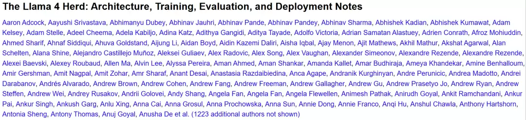尽管如此,这篇报告还是将 Llama 4 项目的所有参与者都列入了作者名单——总计超过1300人,足足占了5页篇幅!因此,我们大体可以认为这份报告就是来自 Llama 4 团队本身,尽管其中不少人现已从 Meta 离职,例如前 Meta FAIR 团队研究总监田渊栋。