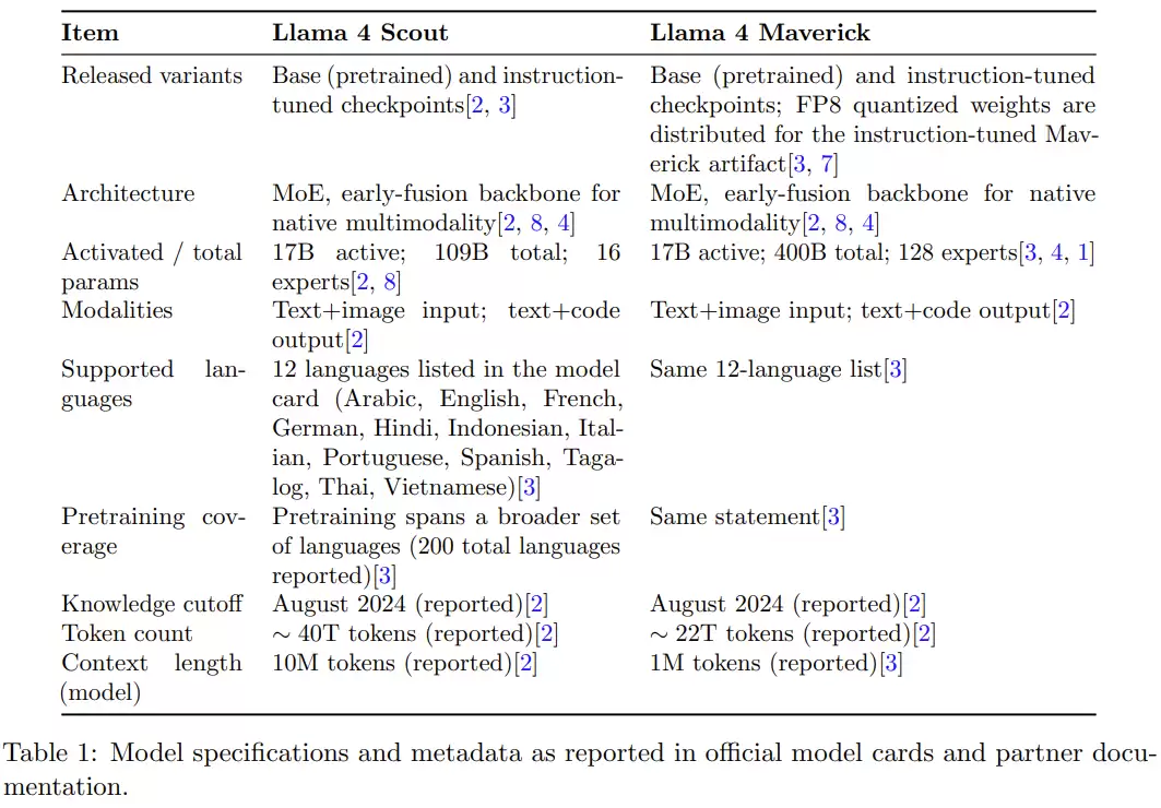 此外,这份报告还总结了「与再分发和衍生命名相关的许可义务,并回顾了公开描述的安全措施和评估实践。其目的是为需要关于 Llama 4 精确、有来源依事实的研究人员和从业者提供一份紧凑的技术参考。」