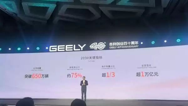 在吉利控股集团举办的创业四十周年大会上,集团CEO安聪慧正式公布了未来的战略蓝图。他宣布,到2030年,吉利控股集团将实现全球年销量突破650万辆,其中新能源车型占比达到75%,海外市场销量超过总销量的三分之一。同时,集团全球营业收入预计将超过1万亿元。这一目标的提出,标志着吉利在全球化、智能化与电动化转型道路上迈出了坚实的一步。