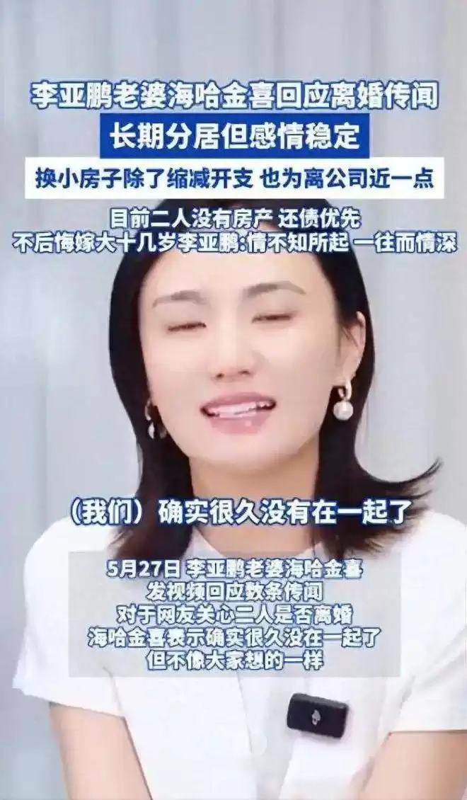 就在5月份海哈金说解和支持丈夫,到十月份就传出俩人离婚的消息,李亚鹏还在直播间说婚姻真相比现实更可怕,耐人寻味。
