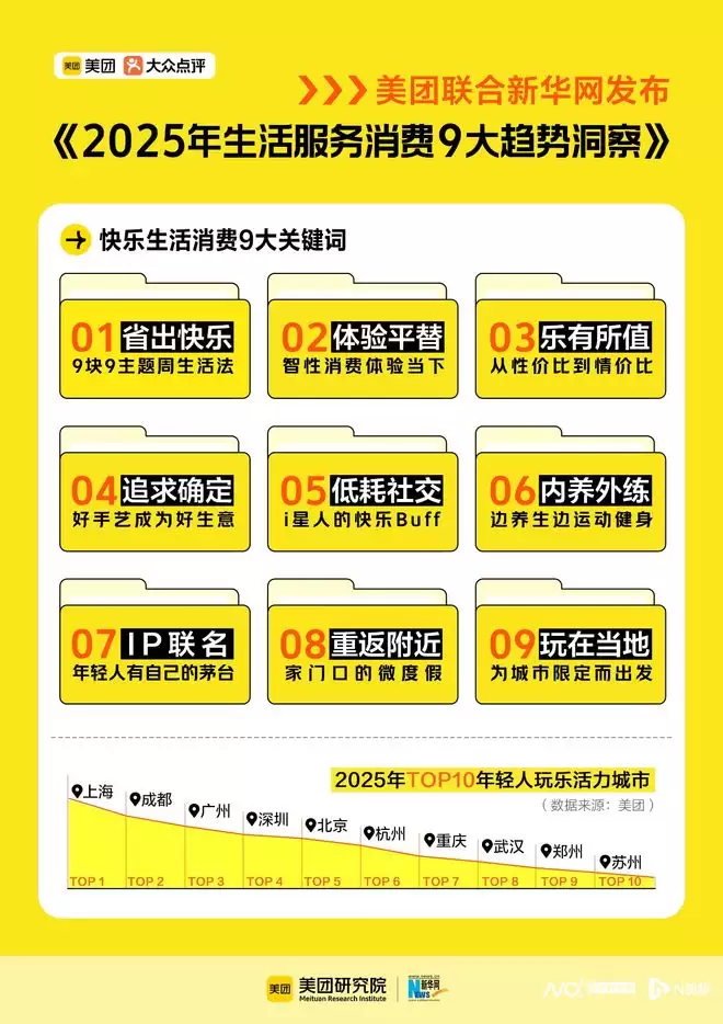 1月21日,《2025生活服务消费趋势洞察》报告发布。报告指出:2025年,美团APP上与快乐生活相关的服务消费订单量同比增长36%,95后消费者占比近6成,上海、成都、广州、深圳、北京、杭州、重庆、武汉、郑州、苏州位列TOP10年轻人玩乐活力之城。据报告,2025生活服务消费九大关键词为:省出快乐、体验平替、乐有所值、追求确定、低耗社交、内养外练、IP联名、重返附近、玩在当地,提供新奇感、释放压力、彰显态度的“情价比”消费悄然崛起。