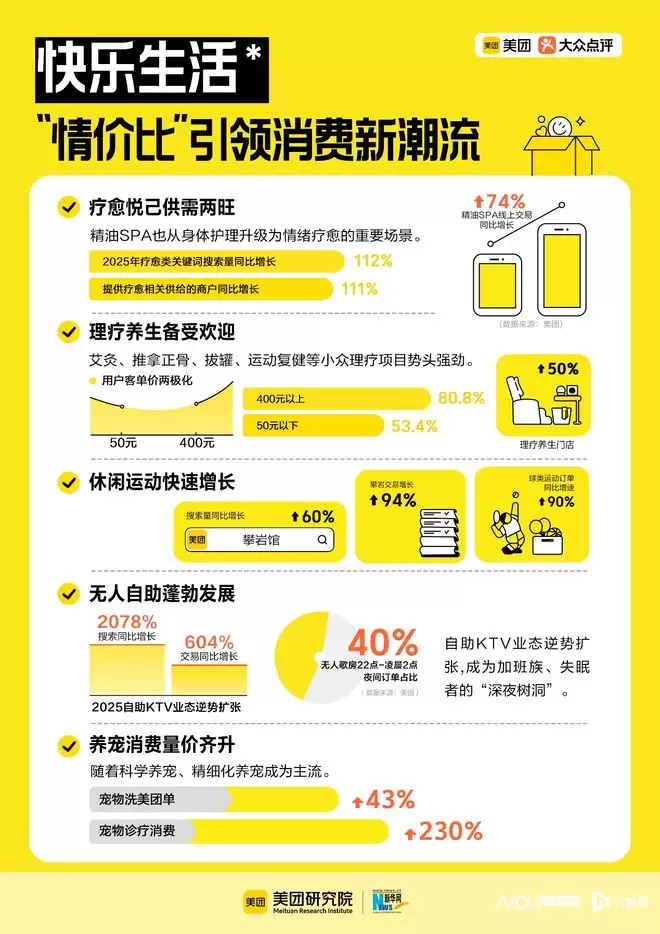 疗愈类服务消费供需两旺。据报告显示,2025年美团疗愈类关键词搜索量同比增长112%,提供疗愈相关供给的商户同比增长111%,不少年轻人把疗愈消费当作“情绪创可贴”。
