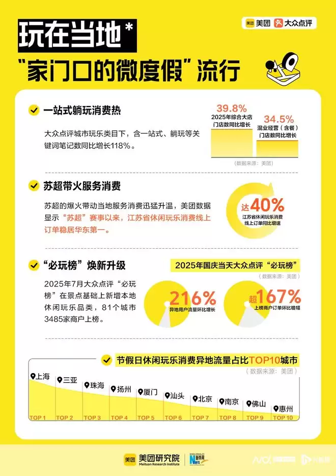 2025年冬季,“南泥北运”如期上演,东北洗浴中心挤满了体验搓澡的南方游客,甚至包括不少外国人。以美团2026洗浴指南三钻商户“沐里沐外”为例,异地消费用户占比超40%。2025年,苏超的爆火带动当地服务消费迅猛升温,美团数据显示“苏超”赛事以来,江苏省休闲玩乐消费线上订单稳居华东第一,同比增速达到40%左右。
