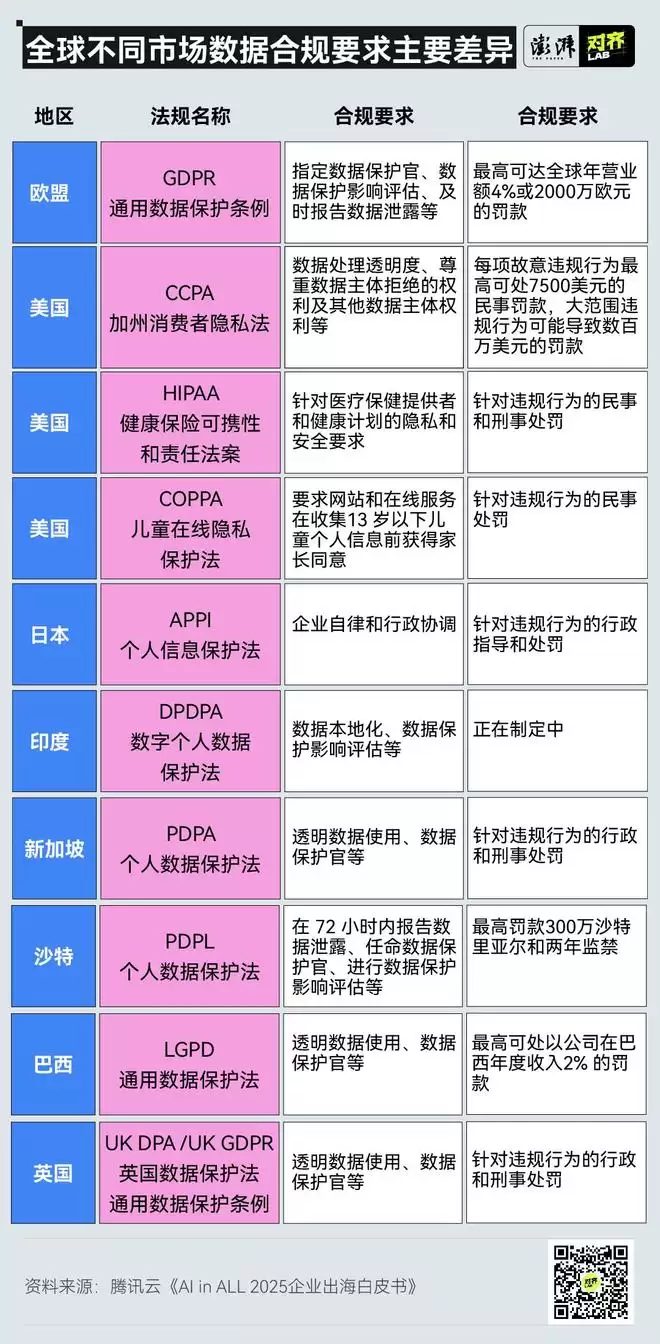 全球AI技术不断跃进的同时,欧盟、美国、日本、新加坡等地区陆续出台了数据合规相关法规,监管要求进一步收紧。各国监管机构在个人隐私数据保护、明确企业责任等核心问题上达成了一定的共识,但在具体的适用范畴、合规要求和处罚力度上仍存在明显差异。