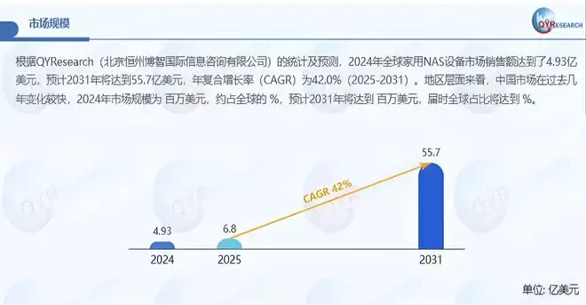 根据QYResearch最新发布的市场研究报告,全球家用NAS设备市场规模预计将从2024年的约4.93亿美元稳步增长至2025年的6.8亿美元,在预测期内以42%的复合年增长率持续扩张,到2031年有望达到55.7亿美元。