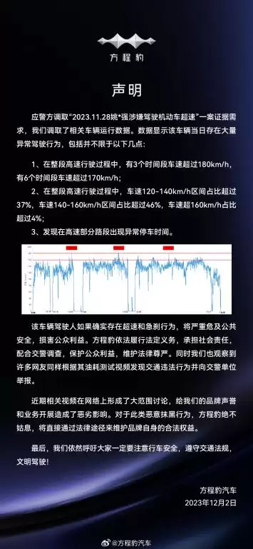 2024年12月,正值方程豹豹5上市之际,姚*强通过抖音账号“大秦军陕团”发布视频,声称以正常驾驶方式测试方程豹旗下车型豹5,得出“百公里油耗18升”的结论,在网络上引起了广泛关注与热议。之后应警方调查取证需要,比亚迪调取的数据显示:测试当日车辆存在大量异常驾驶行为,高速行驶过程中有3个时段车速超过180km/h,有6个时段车速超过170km/h,而在整段高速行驶过程中,车速120-140km/h区间占比超过37%,车速140-160km/h区间占比超过46%,车速超过160km/h占比超过4%。
