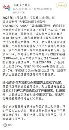 面对无端抹黑,比亚迪和方程豹汽车采取了双线并行的理性举措:一方面依托法律途径积极捍卫品牌权益,2024年5月,比亚迪发布公告称决定正式对博主“姚*强”提起法律诉讼,要求其公开道歉并赔偿500万元人民币。