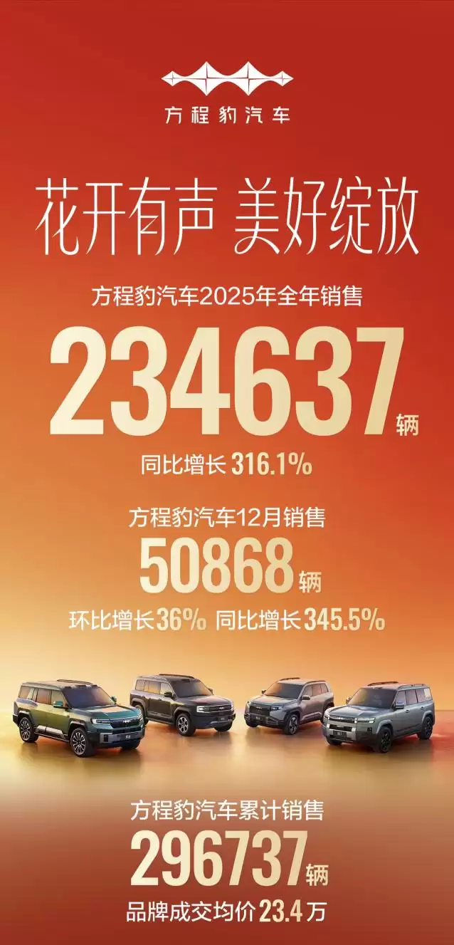 “越野新王”豹5在诸多抹黑中逆势增长,不仅是2025年12月硬派越野销量冠军,更是2025年全年硬派越野销量冠军,销量表现依旧稳健。
