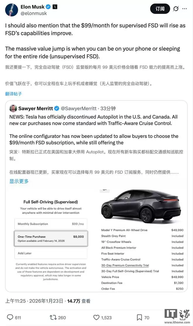IT之家1月23日消息,今日午间,特斯拉CEO埃隆·马斯克在X平台发文预告:完全自动驾驶(FSD)监督版的每月订阅费用为99美元(按当前汇率约合691元人民币),未来将随着FSD功能的不断升级而上调。