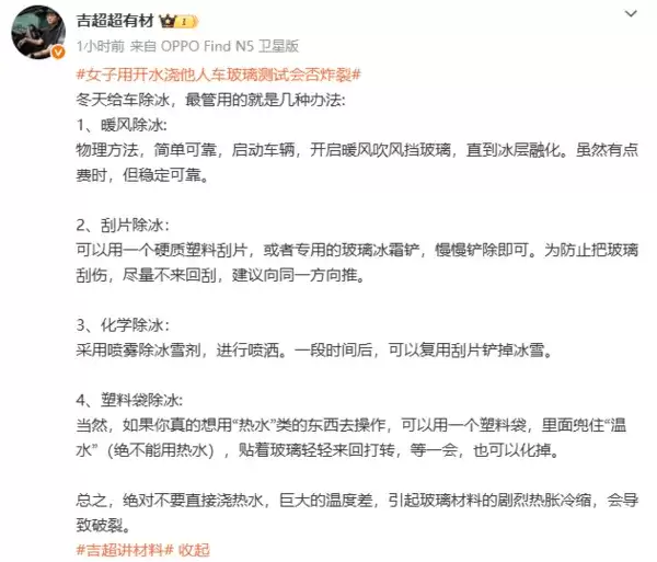 如果想借助“热水”这类物品辅助除冰,可以试试塑料袋除冰法。准备一个塑料袋,装入温水(切记不能用热水),将塑料袋贴着玻璃轻轻来回转动。稍等片刻,冰层就会逐渐融化。不过,“吉超超有材”特别提醒,绝对不能直接往车玻璃上浇热水,因为巨大的温差会导致玻璃材料剧烈热胀冷缩,进而可能引发玻璃破裂。