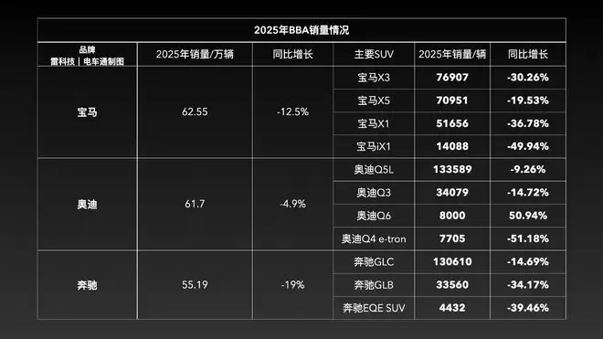 这并不是电车通危言耸听。曾几何时,BBA在中国市场如日中天,年销70万辆是家常便饭,但去年BBA三家销量集体大幅跳水,最令人唏嘘的莫过于奔驰,不仅年销量跌至55.19万辆,更惨遭奥迪反超,昔日的王者光环瞬间黯淡。