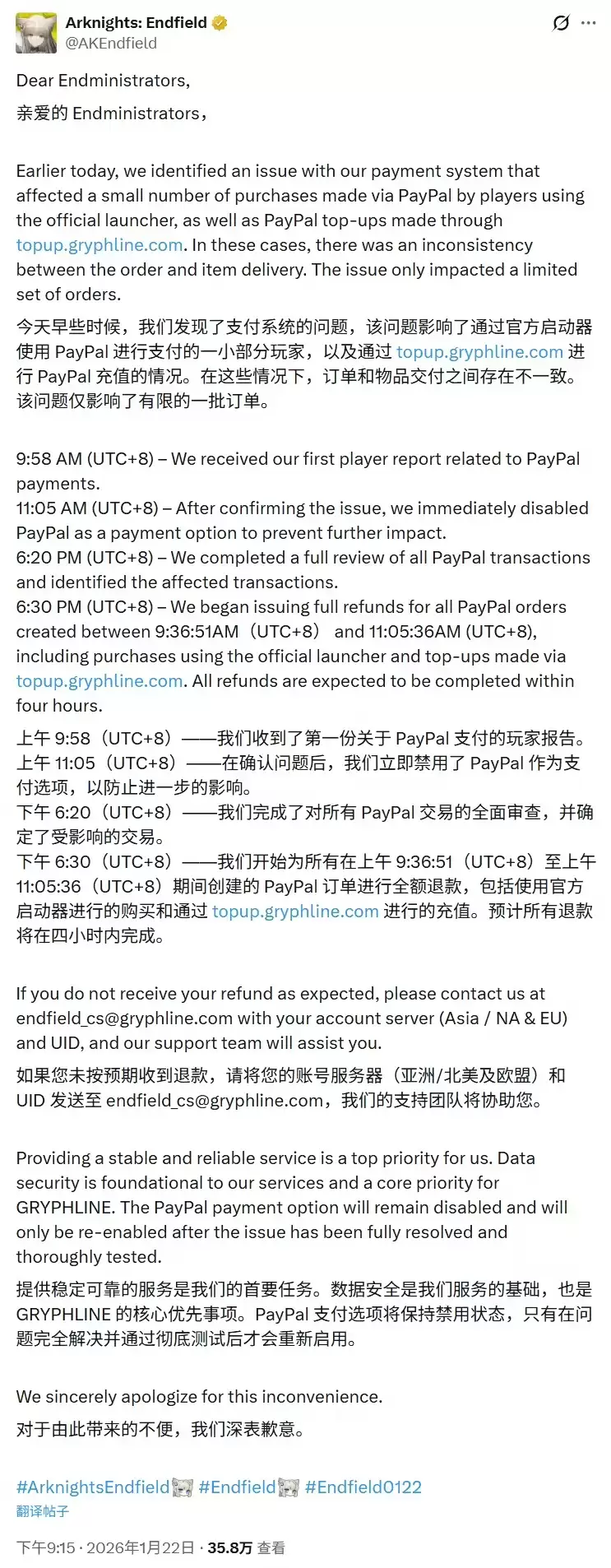 《明日方舟:终末地》官方在其最新的X平台公告中表示,当天发现了支付系统存在异常问题。该问题影响了一小部分通过最新版启动器使用PayPal进行支付的玩家,以及通过指定充值页面使用PayPal充值的情况。