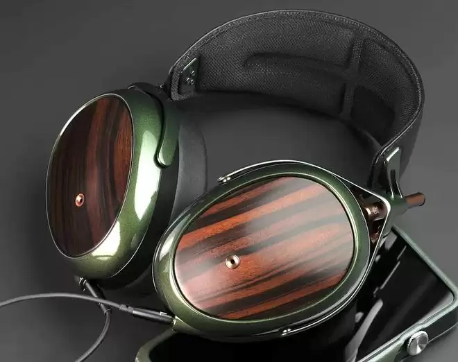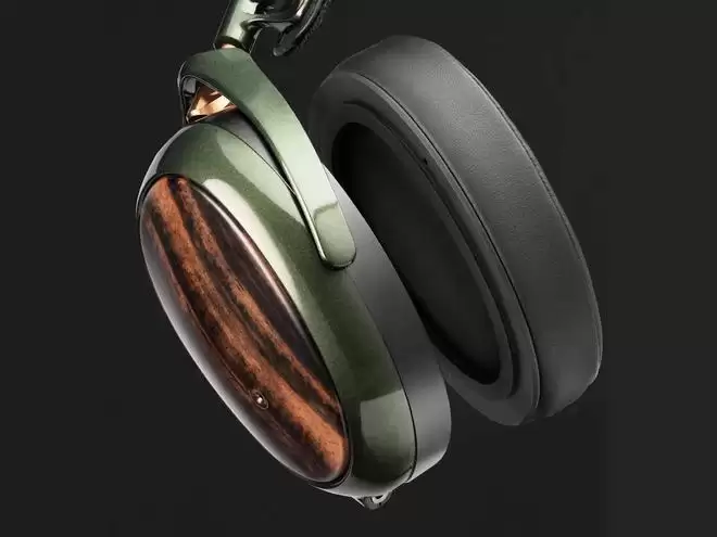 外观方面,这款耳机融合了手工打磨的望加锡黑檀木与多层金属绿涂装的镁合金框架,延续了品牌对天然材质的偏爱。