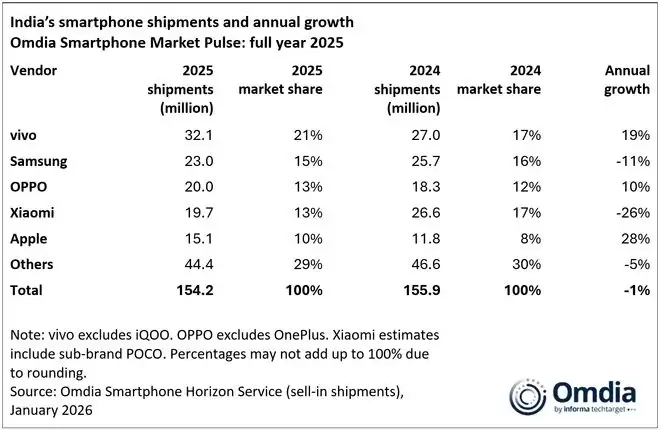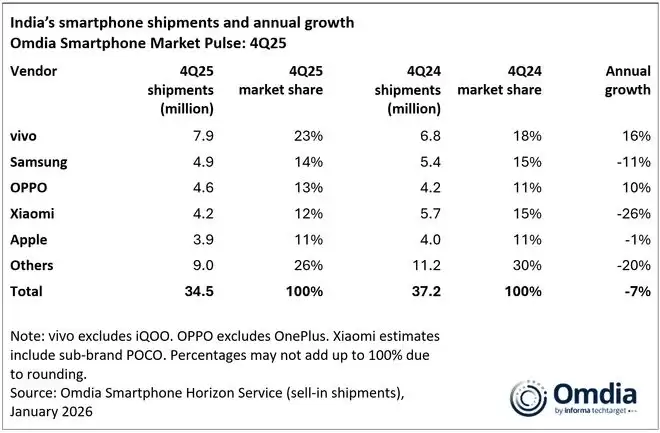 近日,市场调研机构Omdia发布的最新研究显示,2025年第四季度,印度智能手机市场出货量约为3450万台,同比下降7%;2025年全年出货量约为1.542亿台,同比小幅下滑1%。其中,vivo在季度和全年出货量上都稳居市场首位。