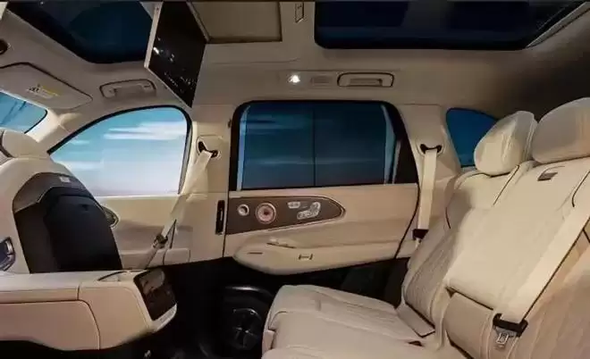 车顶提供前后两块玻璃天幕,并且全部配备遮阳帘,中间则是可翻转的后排娱乐屏。同时,在前排中央扶手的后方也单独配备了一块显示屏,下方疑似是一个开关按键,有可能是冰箱的开关。
