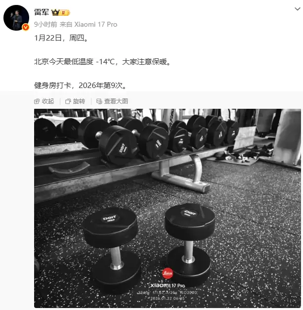尽管身处舆论风暴中心,雷军仍保持着规律的运动习惯。新年伊始,他公开立下2026年健身目标:完成100次打卡,平均每3.6天一次。这一计划对他而言并非难事——2025年他实际完成了125次打卡,提前三个月超额达成目标。截至1月22日,今年已完成9次打卡的记录显示,这位56岁的企业家正以实际行动诠释着“自律即自由”的人生哲学。