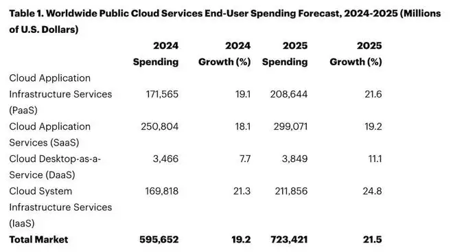 SaaS已成为企业数字化的标配,企业每年投入大量预算购买SaaS系统,Gartner曾预测,2024年全球终端用户在SaaS上的支出达到2508亿美元,2025年预计将接近3000亿美元,SaaS仍是公有云支出的最大板块之一。