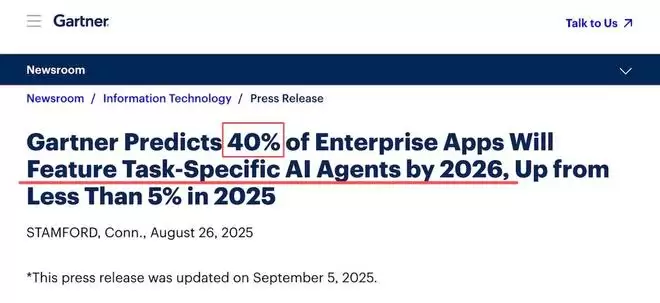 Gartner在2025年发布的预测显示,到2026年将有40%的企业应用集成任务型AI Agent,而在2025年这一比例还不足5%。