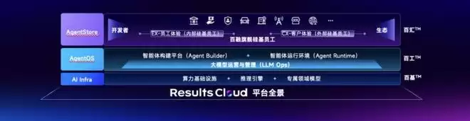 “结果云”由三层构成:底层的“百基”提供AI算力、推理引擎与专属模型;中间的“百工”是智能体操作系统,支持原子化能力的构建与调优;最上层的“百汇”则是Agent Store,内置了多个可直接调用的“硅基员工”。