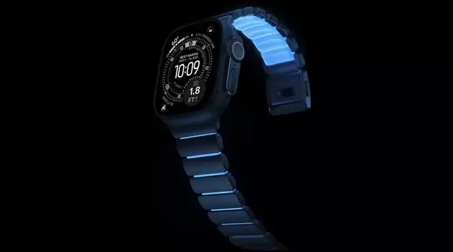 1月23日消息,配件制造商Nomad近日推出了一款专为Apple Watch设计的“冰蓝夜光钛金属表带”。据官方介绍,这款表带在暗光环境下能散发出微妙的荧光效果,售价为189美元。