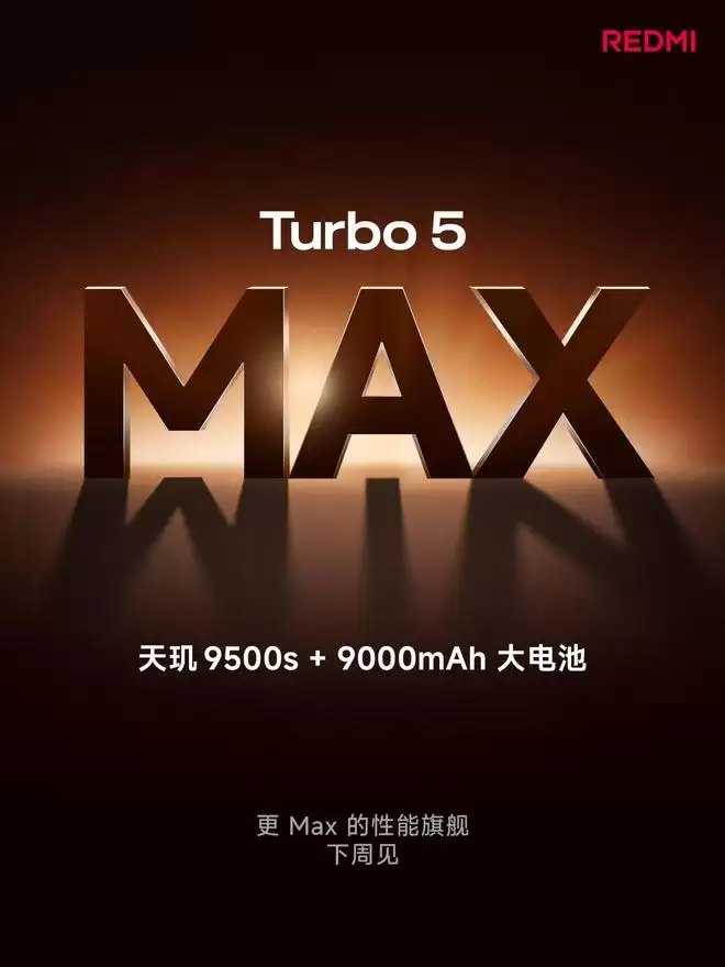 1月23日消息,据IT之家报道,小米旗下的Redmi品牌今日正式宣布,全新旗舰手机Redmi Turbo 5 Max将于下周亮相。这款机型将全球首发搭载全新的旗舰级处理器“天玑9500s”,并配备迄今为止小米手机中容量最大的9000mAh“金沙江”电池。
