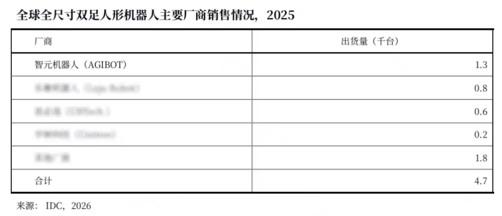 根据IDC于2026年1月23日发布的《全球人形机器人市场分析》报告,2025年全球人形机器人出货量约1.8万台,同比增长约508%。中国厂商在规模化商用进程中占据主导地位。智元不仅拿下全球整体出货量第一,还在全尺寸细分领域出货量中斩获第一,市场份额显著领先。