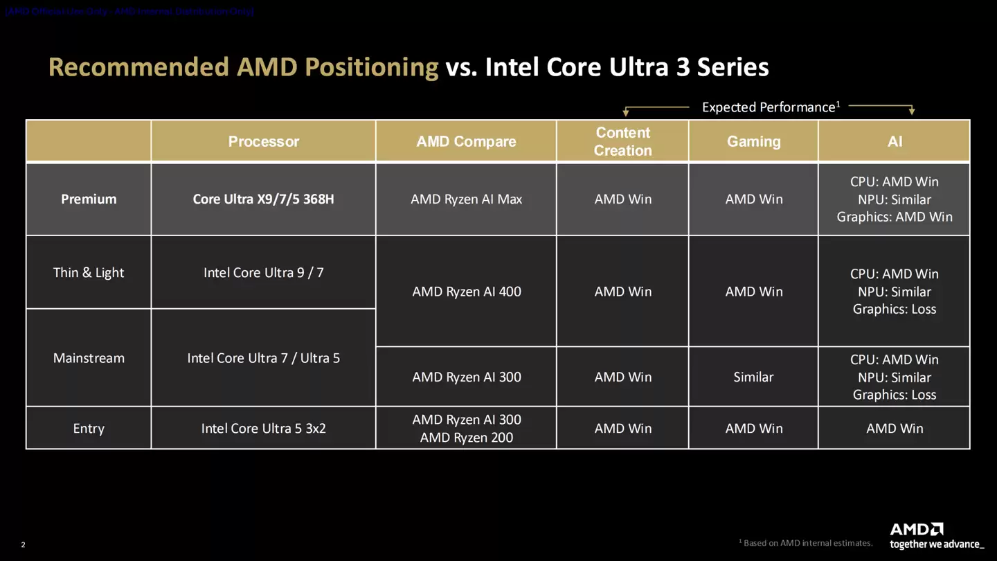在入门级领域,AMD利用Ryzen AI 300和Ryzen 200系列阻击英特尔的“Wildcat Lake”,声称将在内容创作、游戏和AI性能上实现“三杀”。