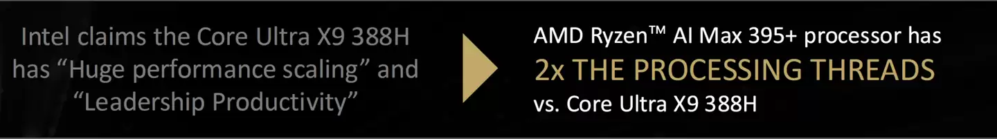 AMD指出,英特尔在该细分市场的大部分芯片仅配备4个Xe3图形核心,仅为其完整规格的三分之一。相比之下,AMD保留了Radeon 890M/880M核显,拥有12至16个计算单元(CU)。这意味着在相同的功耗区间内,AMD有望在游戏和内容创作性能上继续保持领先。