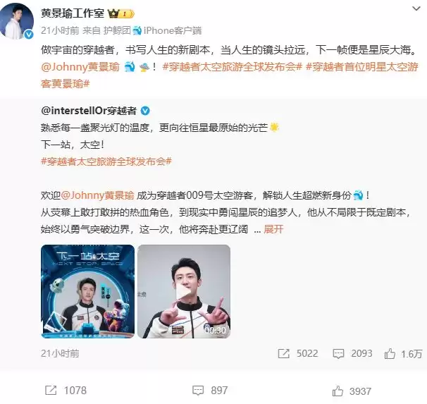 此次太空飞行的同行人员,有中国工程院院士、科技公司高管、品牌创始人等20余人,黄景瑜是唯一娱乐界代表。有网友说:“30万买一广告也好的,这下更狂得没边了。”