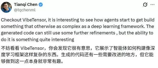 比如陈天奇表示:VibeTensor 很有意思,它表明 AI 智能体能够构建深度学习框架这样复杂的东西。「生成的代码还有一些需要改进的地方,但它能够做到这一点本身就非常有趣。」