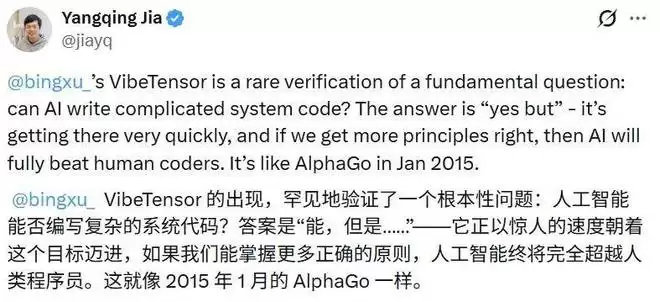 贾扬清的评价则更高,他表示该项目的出现罕见地验证了一个根本性问题:AI 能否编写复杂的系统代码?而该项目给出的答案是「能,但是……(仍有问题)」。他说 AI 正以惊人的速度前进,「如果我们能掌握更多正确的原则,AI 终将完全超越人类程序员。这就像 2015 年 1 月的 AlphaGo。」