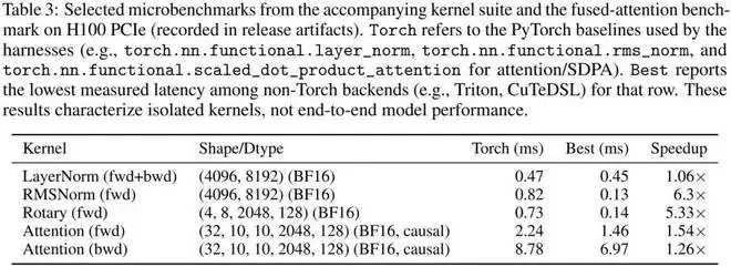 值得注意的是,AI 生成的内核并非只是「能用」,在 H100 的实测中,其生成的 Fused Attention 内核在特定形状下,前向计算比 PyTorch 的原生 FlashAttention 快了 1.54 倍,后向计算快了 1.26 倍。尽管这只是孤立算子的表现,但它证明了 AI 在掌握硬件特性(如 Hopper 架构的 TMA 或 Tensor Cores)方面的巨大潜力。